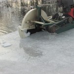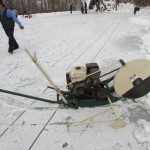 The first order of business was to mark the area of ice to be cut with parallel lines about 16 inches apart with a circular saw on a sled.