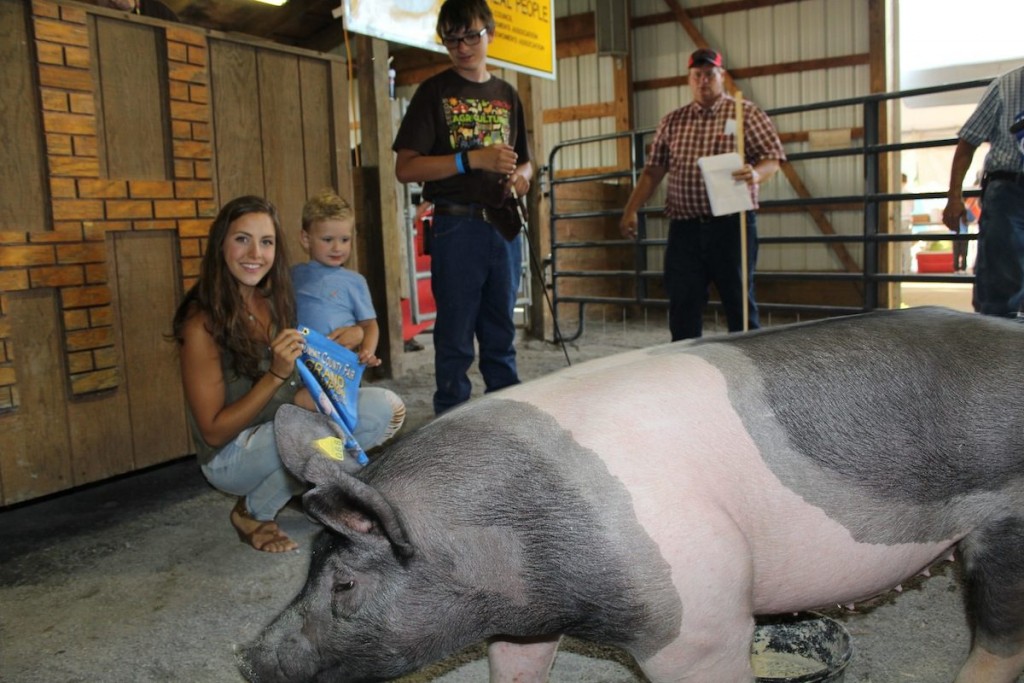 Corey Soulek (right) sold his 285-pound grand champion market hog for a record $9.50 a pound to Andrea Rykalla and Maxx Marhofer, representing Ron Marhofer Auto.