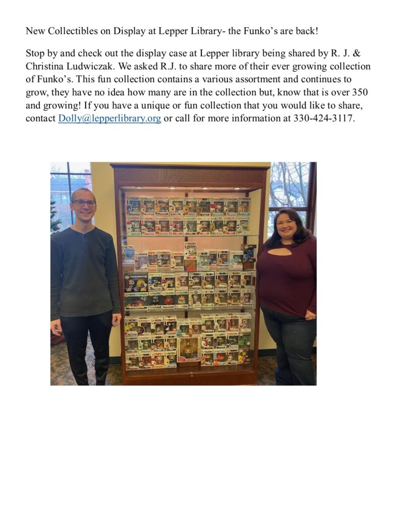 Stop by and check out the display case at Lepper library being shared by R. J. & Christina Ludwiczak. We asked R.J. to share more of their ever-growing collection of Funko’s. This fun collection contains a various assortment and continues to grow, they have no idea how many are in the collection but, know that is over 350 and growing! If you have a unique or fun collection that you would like to share, contact Dolly@lepperlibrary.org or call for more information at 330-424-3117.