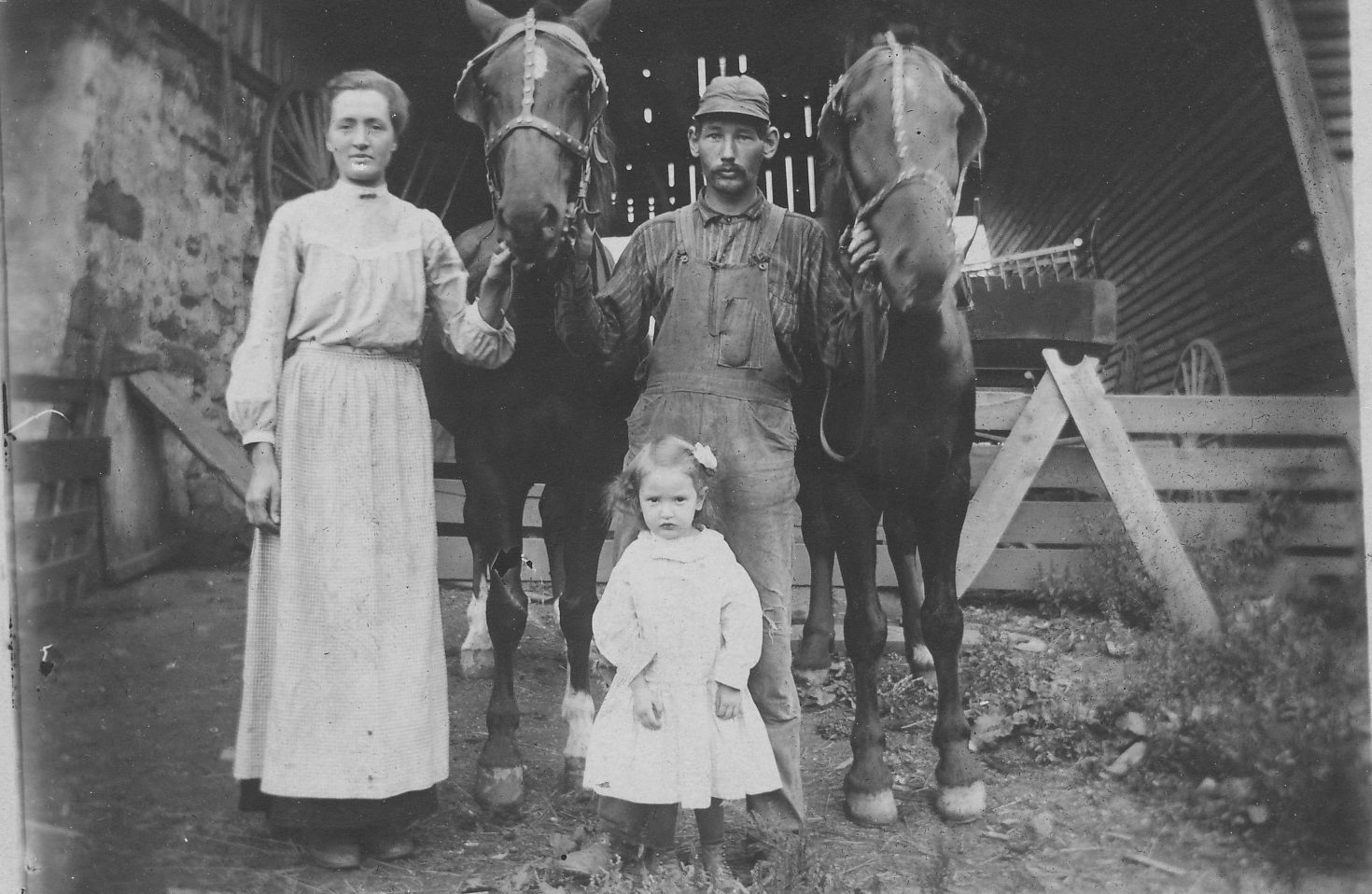 Taken in Hesston, Pennsylvania in 1902, this photo shows Bertha Corcellus, Peter Corcellus and their daughter, Carrie Corcellus. Carrie was born in 1907.