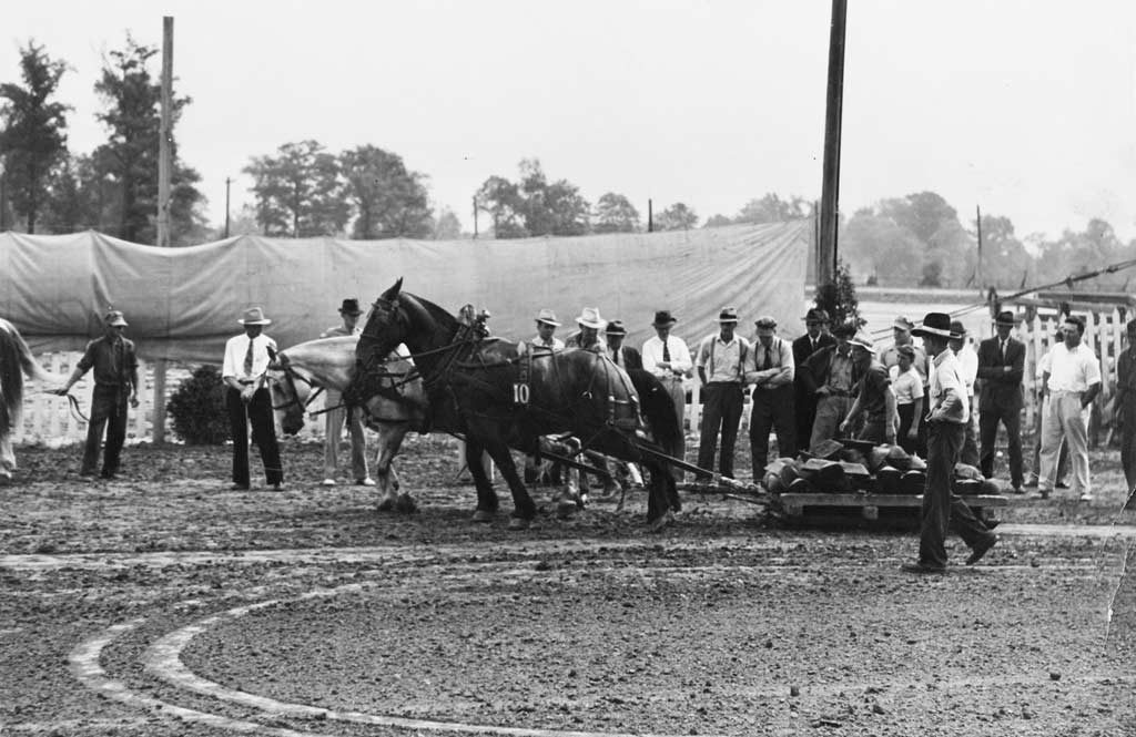 The late Donald T. McKarns (on the far side of his team in the white fedora) won first place during the 1940 Canfield Fair with this pulling team. His son, Bill T. McKarns, of Hanoverton, submitted the photo.