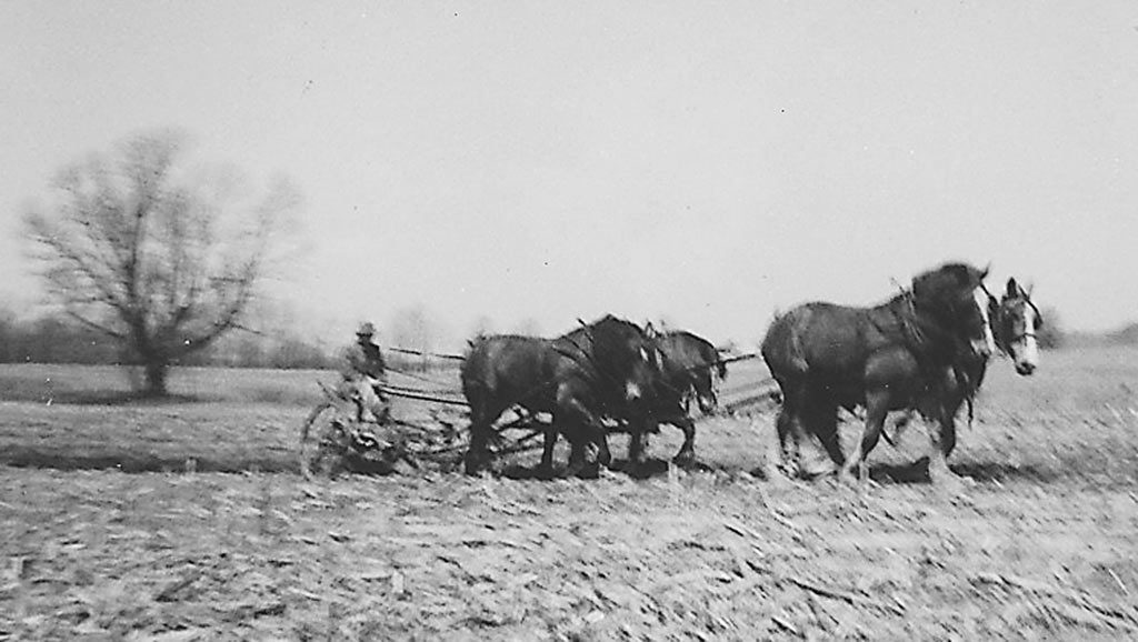 Brenner plowing with a tandem hitch in April, 1962, on the Dave Moving farm near East Greenville, Ohio. Wife Matilda writes, “Merwyn still loves his horses, however he has retired now. At age 861⁄2, too much work for an old man!”