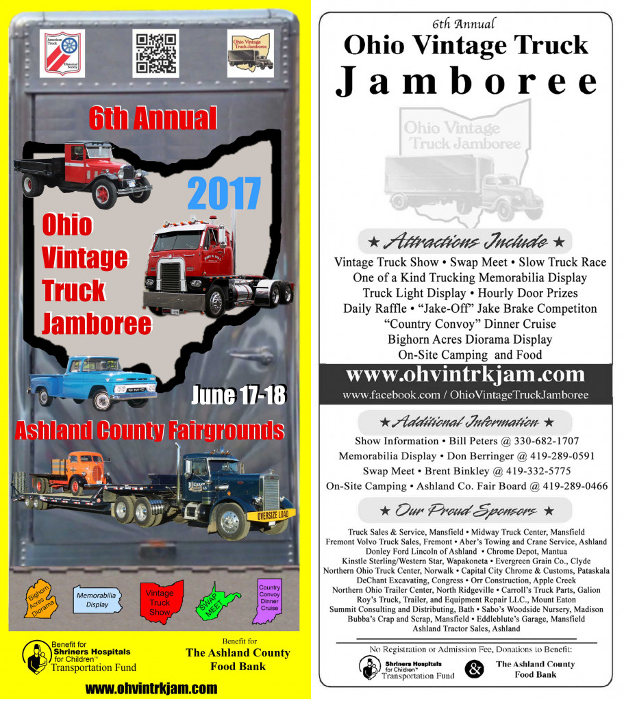 6th Annual Ohio Vintage Truck Jamboree, Ashland, OH – Ashland County Fairgrounds, 2042 Claremont Avenue, Ashland, OH 44805 June 17-18, 2017 Hosted by the Ohio Chapters of the American Truck Historical Society. Show Hours 9am to 4pm Sat. 9am to 2pm Sun. Vintage Truck Show both days, Huge Trucking Memorabilia Display, Swap Meet, On-Site Camping with RV Hookups available. Slow Race, Jake-Off, Light Show, Diorama Display, Truck Swap Meet, Country Convoy, and More!
