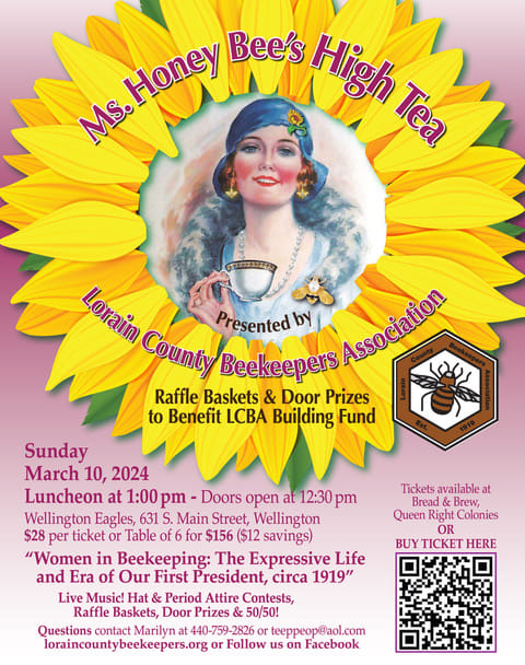 You are cordially invited to Ms. Honey Bee’s High Tea! Bring a friend and join the Lorain County Beekeepers Association (LCBA) for a delightful afternoon of music, food, raffles, door prizes, and of course, tea. Be sure to dress for the occasion, as there will be contests for the best hat and period attire! Doors open at 12:30pm; Luncheon begins at 1:00pm.