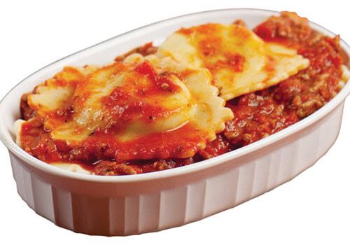 Ravioli are either square or round and stuffed with meat, cheese, vegetables, or seasonings. Ravioli is typically served with red sauce.