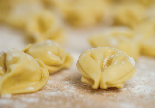 Tortellini pasta is ring-shaped. It’s stuffed with meat, cheese or vegetables and served in a cream sauce or broth.