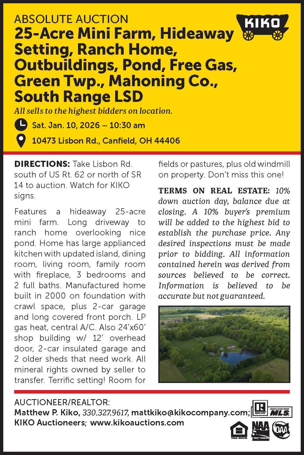 25 Acre mini farm, Ranch home, outbuildings, pond, free gas, and misc.