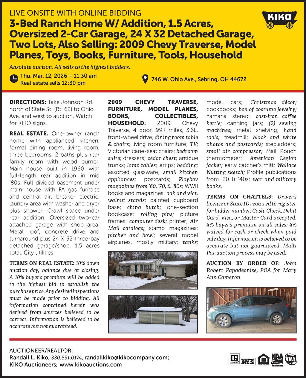 3 bedroom Ranch home with 1.5 acres, oversized garage, detached garage, household, 2009 Chevy Traverse, and misc.