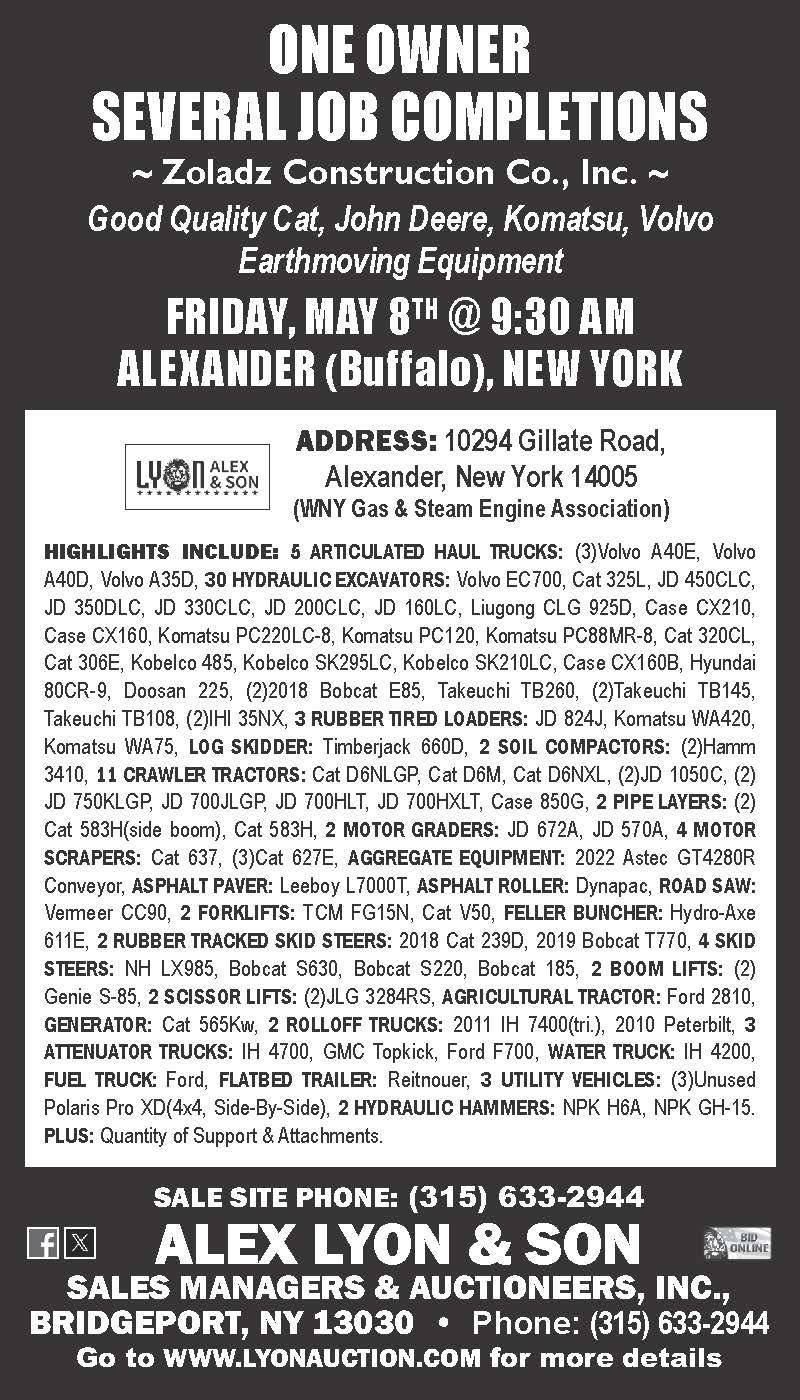 Cat, John Deere, Komatsu, Volvo earthmoving equipment, and misc.