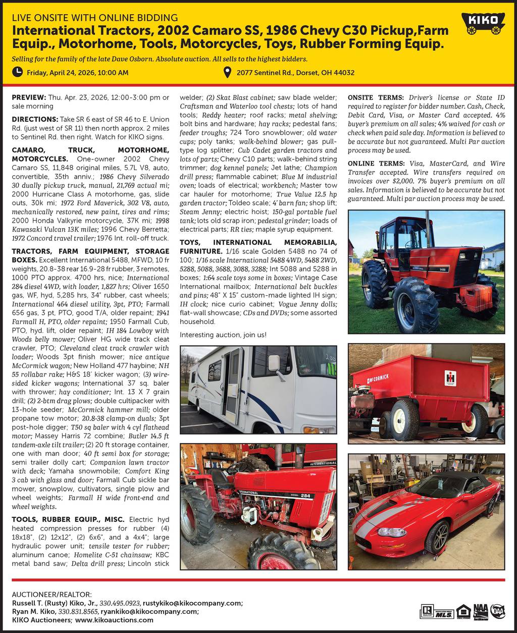 International tractors, 2002 Camaro SS, 1986 Chevy C30 pickup, and misc.
