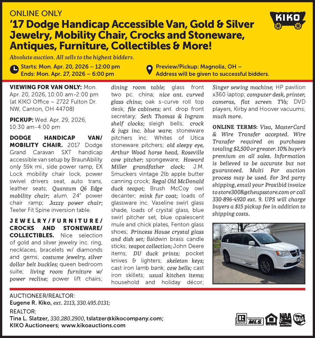 Home Antiques & Collectibles ONLINE ONLY. 2017 Dodge handicap accessible van, gold, antiques, and misc.