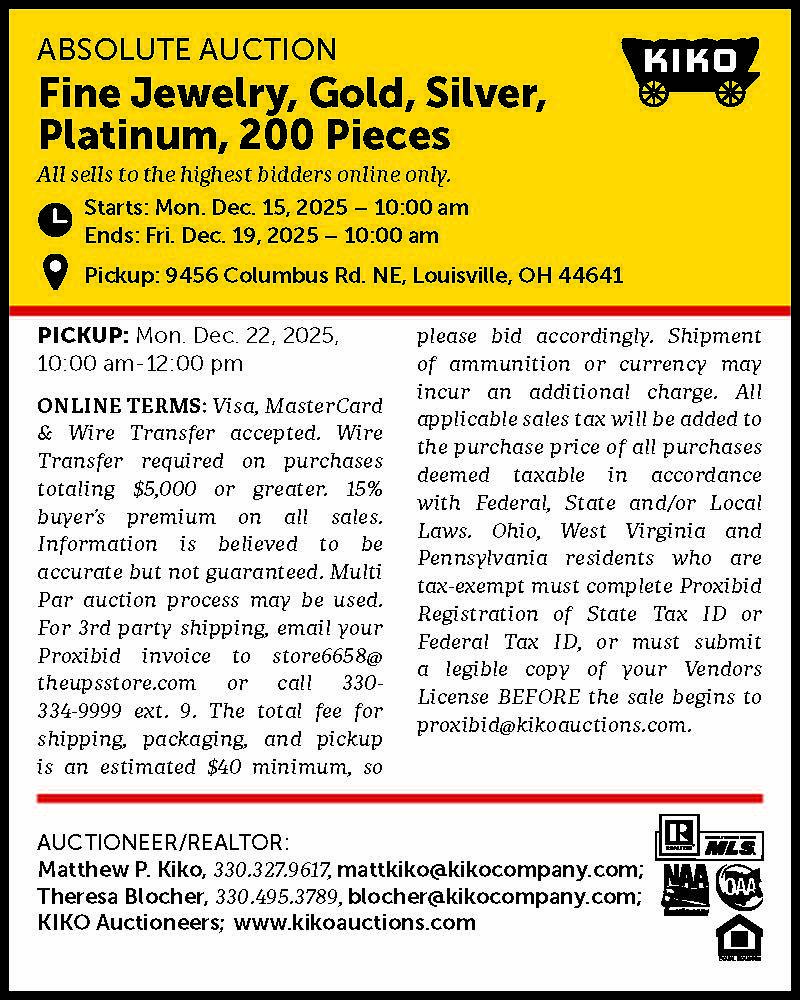 Matthew P. Kiko, 330.327.9617, mattkiko@kikocompany.com; Theresa Blocher, 330.495.3789, blocher@kikocompany.com; KIKO Auctioneers; www.kikoauctions.com