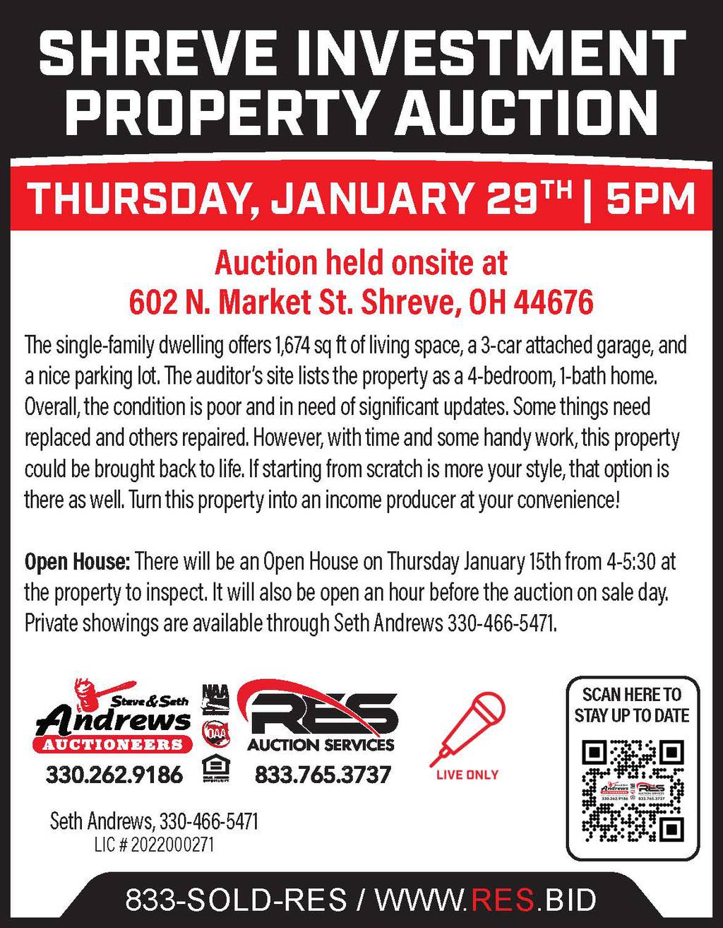 Open House: There will be an Open House on Thursday January 15th from 4-5:30 at the property to inspect. It will also be open an hour before the auction on sale day. Private showings are available through Seth Andrews 330-466-5471.