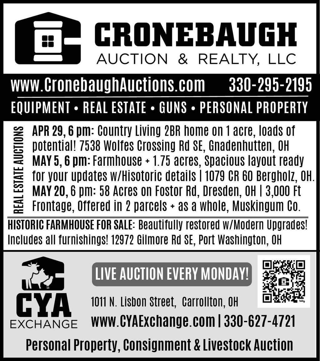 Home Agriculture / Farm UPCOMING AUCTIONS and CYA every Monday. See CronebaughAuctions.com for more details.