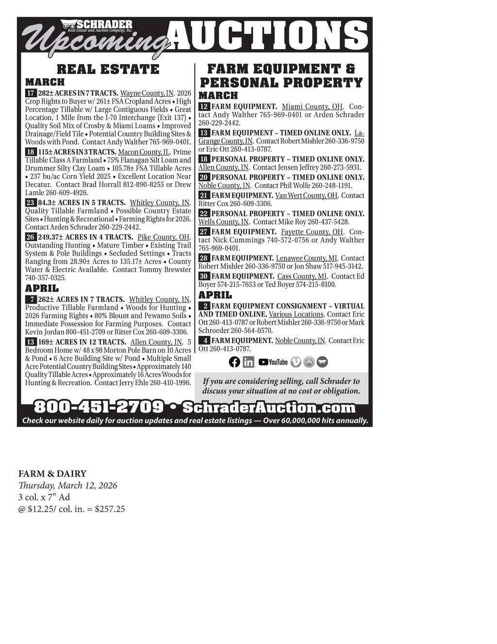 Upcoming real estate, personal property, and misc. For more info on times please visit: www.SchraderAuction.com
