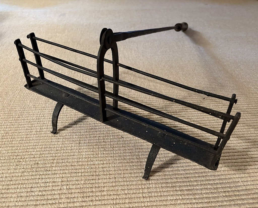 Two distinct styles of bread toasters were used in the fireplace setting. The first was the “kick toaster,” a wrought-iron basket for the bread slices which revolved on a base with three or four legs.
