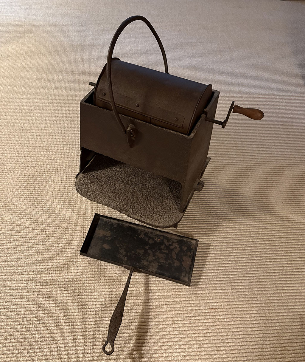 This coffee roaster was used in the historic Snow Hill Nunnery, located just north of Waynesboro, Pa. The wrought iron pan, which held hot coals, was inserted into the cast iron base piece to heat coffee beans in the revolving tin cylinder above it. (Locher collection)