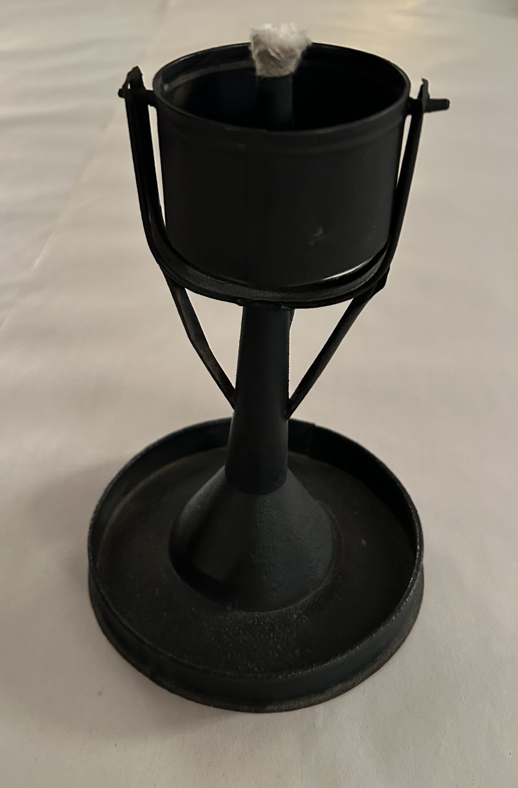 Fat lamps were also made by tinsmiths and blacksmiths. Those crafted by tinsmiths closely resembled the pottery fat lamps, though there was consideration for the limitations of the material involved. The fonts on these lamps were typically cylindrical with a central wick support. Like their ceramic counterparts, they also incorporated a handle, stem and saucer. Unlike the pottery examples, however, tinsmith-made lamps were more likely to contain decorative elements. They were also much lighter in weight and less likely to be broken, thus having a much higher survival rate than pottery examples.