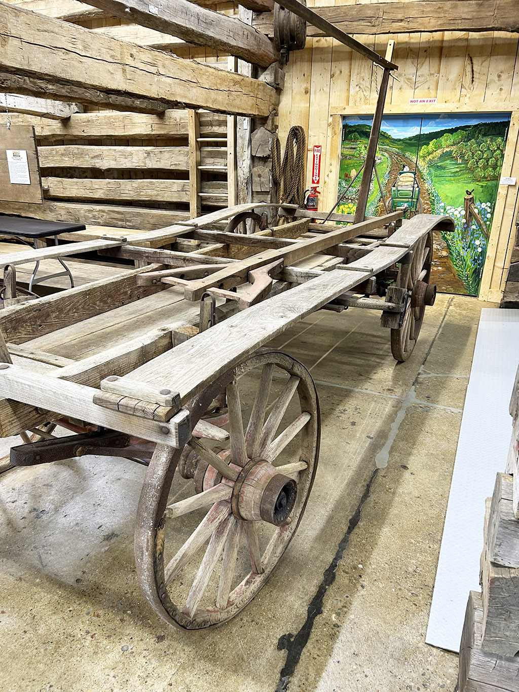 Another feature of the shock wagon was the addition of a stout post at either end of the wagon bed. Each of these posts had a vertical arrangement of holes through which heavy iron pins could be inserted. The posts served essentially as bookends for the load that was piled high on the bed of the wagon. When the load of shocks attained a height where it began to become unstable on the wagon bed, a heavy timber that spanned the space between the two end posts was laid on top of the load to compress and stabilize it. The timber was attached to the end posts of the wagon using iron pins through the holes at the proper height.
