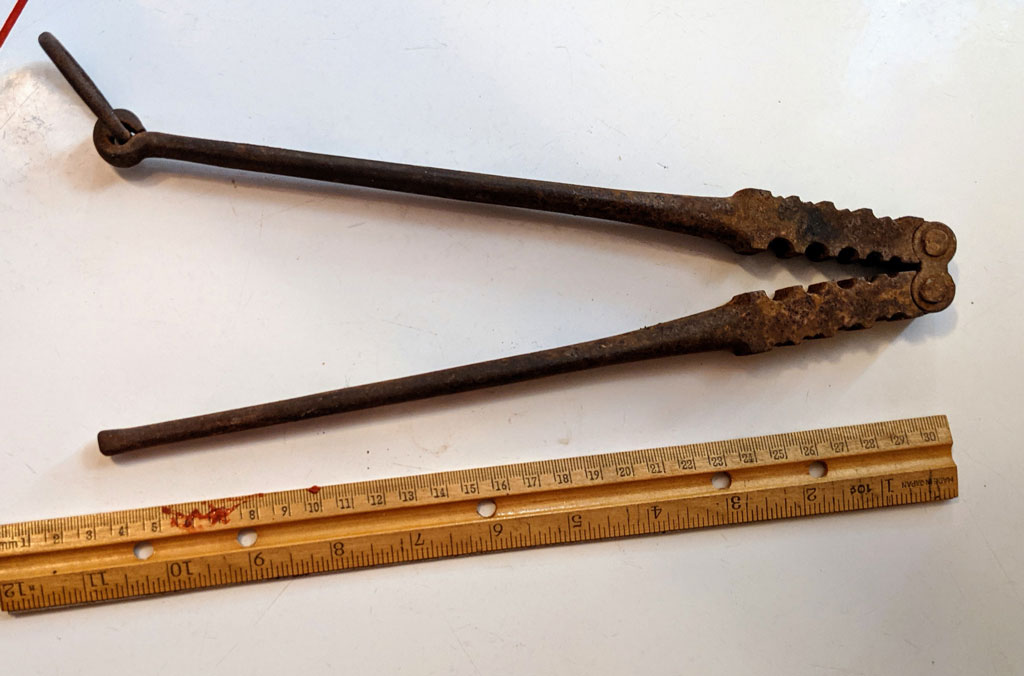 1. Item 1192 is a Western Union splicing tool. It was used to join two pieces of copper wire together by inserting the wire into a double barrel copper sleeve. Bending the ends down to keep the two wires from slipping out of the sleeve, and then clamping two identical tools like the one pictured at each end of the sleeve and twisting them to create a Western Union style splice. The various grooves in the tool were necessary to accommodate the different sizes of line wire and sleeves. Telegraph, Telephone, and Railroad signal people involved in communication and signal line work used this tool everyday on open wire circuits. It was later replaced by the Nicopress crimping tool and single barrel sleeve requiring only a single tool.