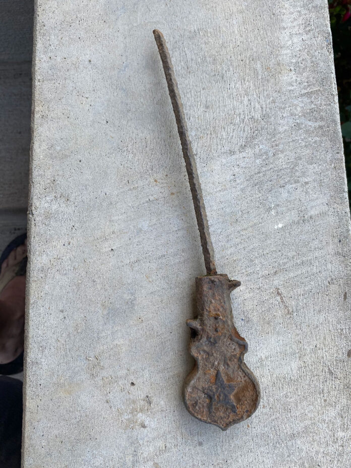 Tom Smith found Item No. 1231 while metal detecting on his farm. He was told it’s a military grave marker or a surveying stake. Surveying stake makes the most sense to Tom as it was approximately 20 feet from a property corner.