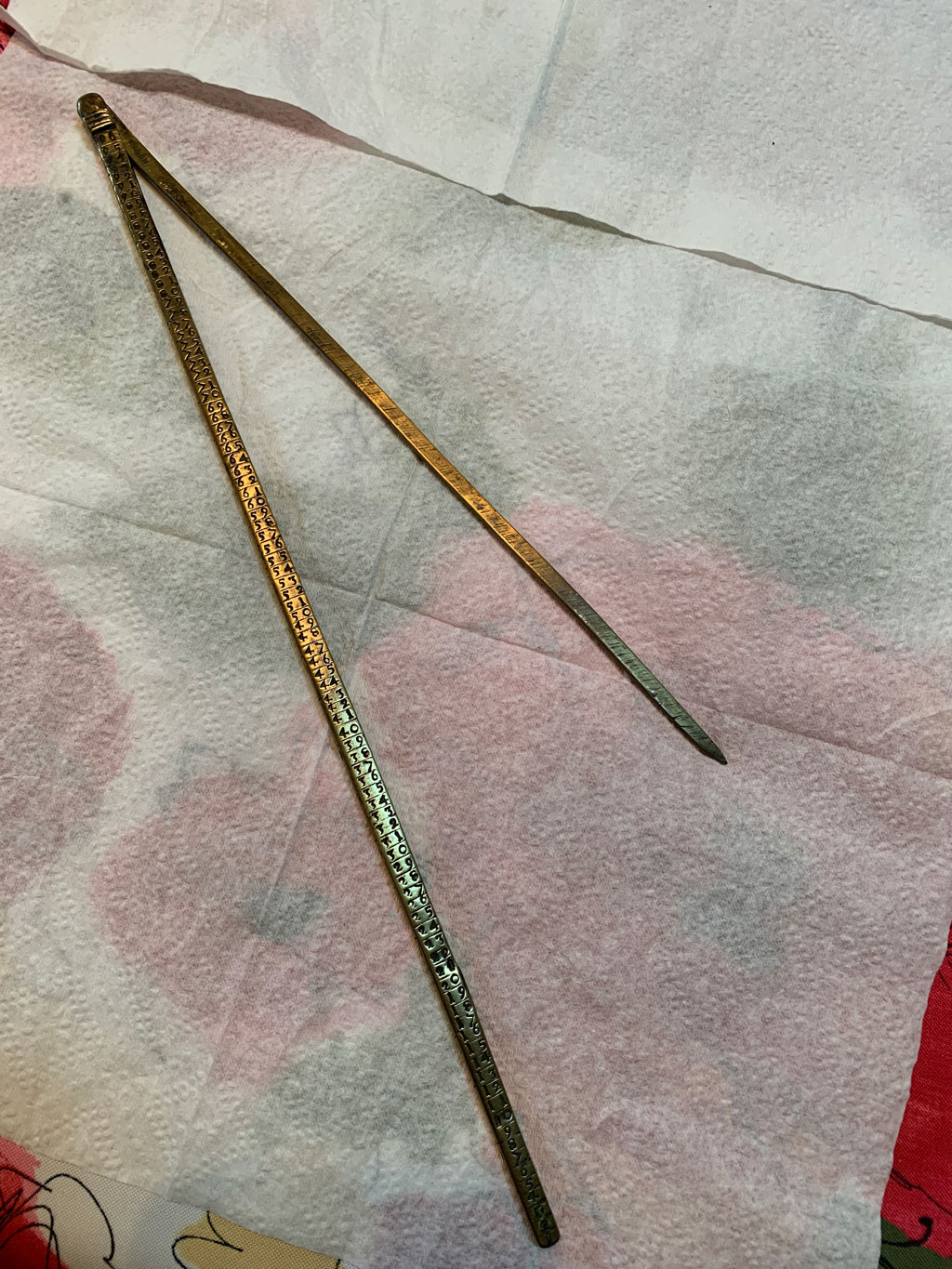 Item No. 1200 was found under the floorboards of an outbuilding on an old farm. It appears to be brass, hinged, and the longer arm has measuring increments and the shorter arm has a slight hook. It folds into the larger arm.