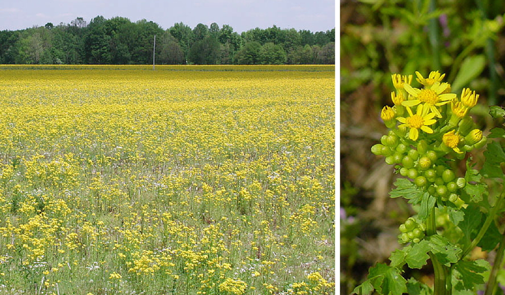 Another weed that has toxic effects to livestock is cressleaf groundsel. This plant emerges early in the spring and has a bright yellow flower. Commonly we see this plant very early in the spring growing in fields prior to being cultivated for corn or soybeans.
