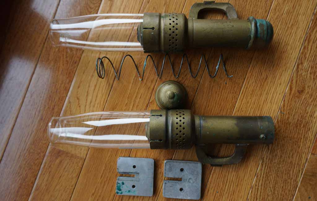 Item no.1046 They look like kerosene lights that were used in caboose’s for conductors to do there paper work. The brackets were secured to the walls and the handles slid down in the slots