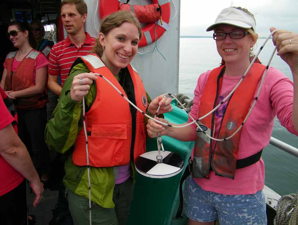 A highlight of the Advanced Wonders of Watersheds workshop, hosted by Geauga and Portage SWCDs, gives participants the opportunity to determine the water's turbidity with a secchi disk at various sampling points on Lake Erie. (Gail Prunty photo)