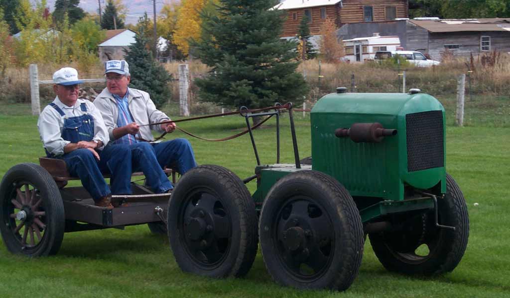 Harold Probasco (left) and columnist Sam Moore are riding on a cart behind the tractor that Harold believes is the prototype built in 1937 by the Bonham brothers of Salt Lake City, Utah. (Darrin Christensen photo)