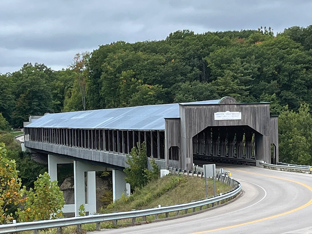 The Pratt Truss design used in the bridge dates back to 1843. Although it uses a historical design, the bridge has a life expectancy of 100 years and supports legal load traffic. We discovered that it is beautiful in the fall with foliage changing earlier in the colder climate in Ashtabula County.