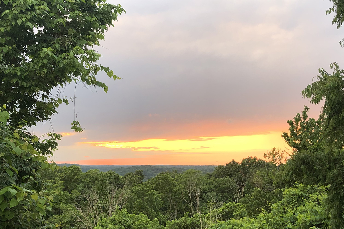 We followed the trail to the highest point. The presence of peach and purple cloud swirls indicated that our timing was perfect. Before us stretched the rolling hills that define Athens County, an area rich in history and unique landscapes.