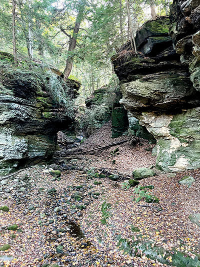 We made our way down to the cave and stopped to admire the sanctuary created by rock outcroppings. The rocks are part of the Sharon Conglomerate, a type of rock sediment found in Northeast Ohio and Pennsylvania. Like a potter leaves finger grooves in a hand-thrown mug, the large boulders have sections of crossbedding. The grooves reminded me of ancient waves or a river moving slowly through time. Honeycomb weathering looked like rock bubbles had burst, leaving open spaces behind.