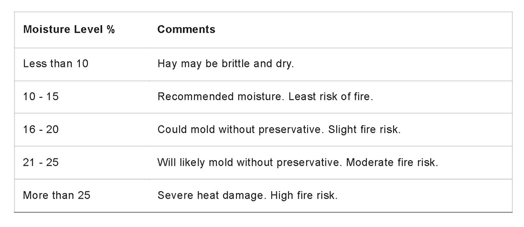 The simplest and most effective way to monitor forage bale moisture and temperature in your operation is by using a forage moisture and temperature probe. This tool allows producers to measure conditions at multiple stages during harvesting, curing and storage. While purchasing a probe requires a small investment of time and money, the cost is minimal compared to the potential losses from a forage-related fire.