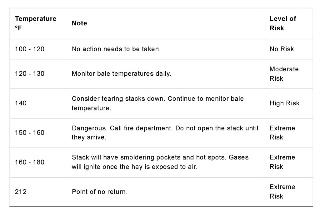 The heat generated inside a bale, referred to as “bale temperature,” results from both plant and microbial respiration. As internal temperatures rise above 140 F, the risk of fire increases significantly. Once a bale reaches approximately 150 F, the temperature typically does not decrease, and spontaneous combustion becomes more likely.
