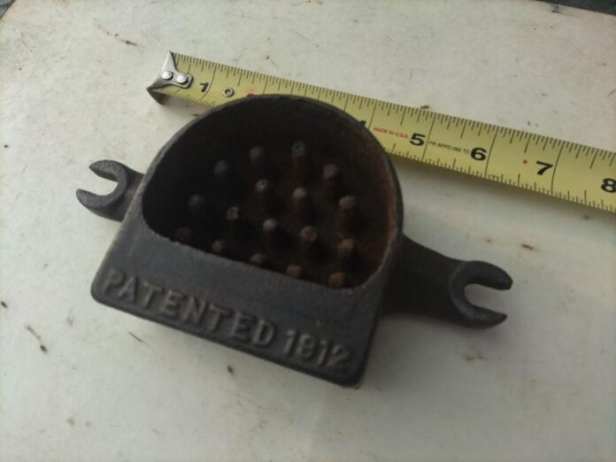 John Beatty thinks it’s an old tire patch vulcanizer or the top half of one. After placing the inner tube and patch between the halves and compressing them together, a burning liquid was placed in the cup and ignited, causing heat to travel down the cast “spikes” and vulcanize the patch to the tube.