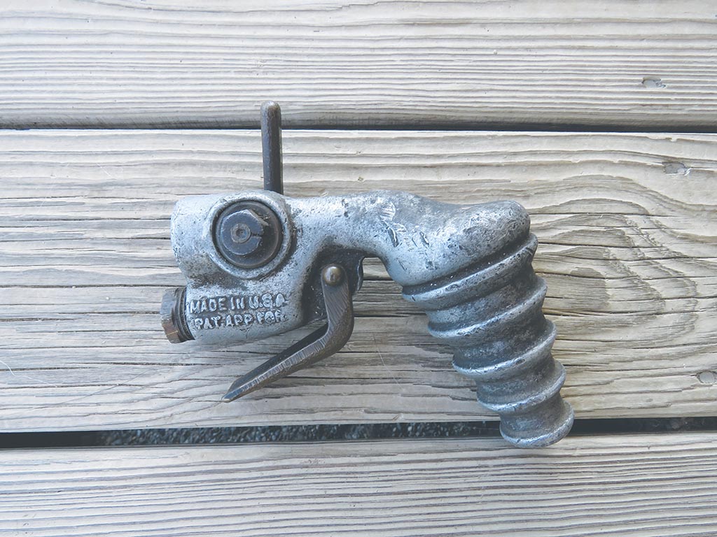 Dale wrote, “The lever controls a ball valve that is on an inlet that has threads to work with a garden hose fitting. The trigger controls a typical cylindrical valve that is on an inlet that has 3/4-inch threads, which then has a reducer installed that would work with a modern compressed air hose fitting, assuming the reducer is an aftermarket addition and that common or industrial compressed air fittings were larger when this was made, which was probably many years ago. There is an outlet on the end with the ribs that also has 3/4-inch threads to the inside. I was told it was a pressure washer and have only tried it once with unimpressive results. I did not thread anything into the outlet, but think this may help as the dimension of the exit is smaller than that of the combined entrance points. Thought your readers may want to weigh in on its operation as well as to whether it was designed for a specific purpose.”