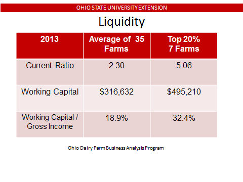 Looking at these measures for the 35 Ohio dairy farms that completed their farm business analysis for 2013 (Table 1), all farms and the top 20 percent of farms had excellent current ratios (CR), but the top 20 percent have a CR more than twice as high as the average of all the farms.