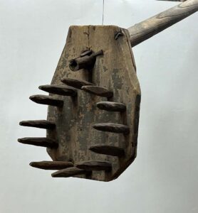 Also located in the barn where they had languished for at least a year were the wrought iron kettle stand — which consisted of a ring in which the kettle sat while suspended about a foot-and-a-half off the ground by three legs — and the wooden apple butter paddles. As the name implies, the paddles were used in stirring the apple butter, and from the number of these that have survived over the decades, it seems that every family must have owned a bunch of them.