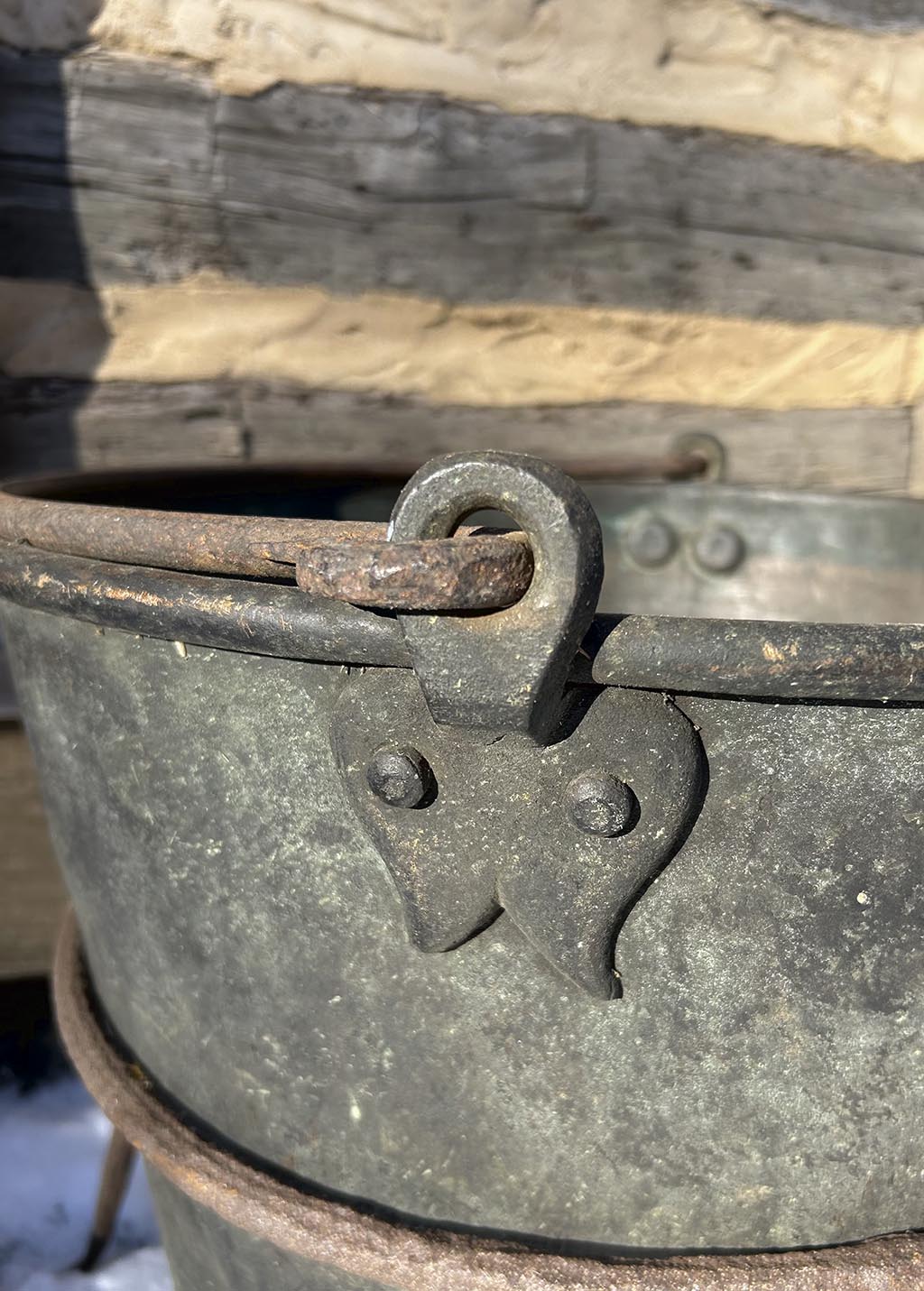 After the circular sides were formed, the one-piece bottom was dovetailed to the sides. The handle was an inch-thick wrought iron rod bent into a semi-circle. Its ends were inserted through wrought iron cleats, which were riveted through the sides, just underneath the rolled rim. The rim disguised a heavy circular iron rod which allowed the kettle to maintain its shape. In the fancier examples, the cleats were wrought by the blacksmith to resemble a tulip, a folk motif that appears integral in many early Pennsylvania German products. Some kettles additionally had copper lids in a shallow pyramidal shape.