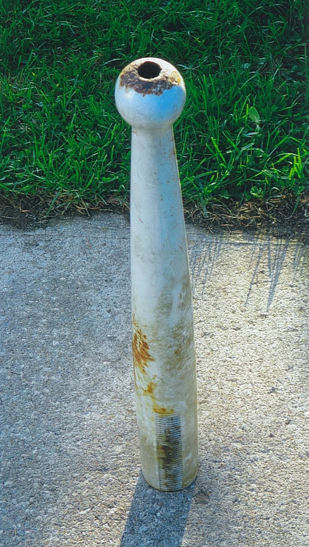 “While tiling a field, we unearthed this object 3 feet from the fence line. It was buried about 12 inches into the soil. It stands 22 inches tall and weighs about 8-9 pounds. There is a threaded portion near one end. Any clue what this white metal object might be?”