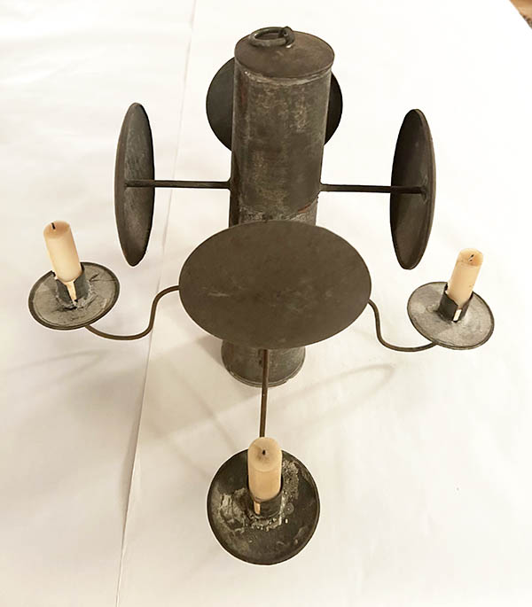 Another type of candleholder made by the tinsmith was the hanging chandelier. This incorporated any number of arms which extended from a central tin or turned wooden core. Each of these arms terminated in a candle cup for a single candle. Such chandeliers often became works of art for imaginative tinsmiths who often embellished them with tin cutouts in the form of leaves or geometric shapes. In some examples, polished tin reflectors were mounted on the arms behind the candles to help better disperse light in the room.