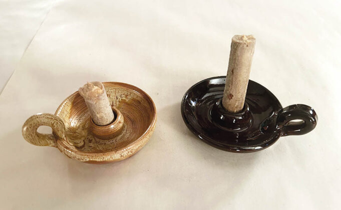 Potters were probably the second most prolific producers of candleholders. They were readily able to take lumps of clay and turn them into candleholders in a vast array of forms, ranging from very simple sockets mounted on a saucer to taller forms incorporating fancy turnings. The application of colorful glazes made them all the more enticing to housewives whose domiciles were otherwise unvaryingly drab. Unfortunately, because of their inherent fragility, few of these early pottery candleholders have survived.