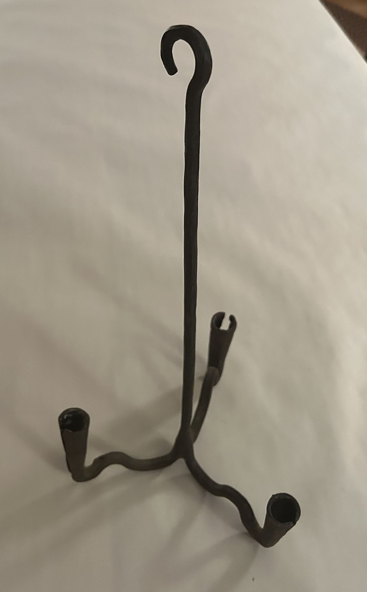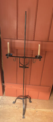 Floor-standing candleholders usually consisted of a straight rod supported by three or four curved legs. The rod supported a cross piece that incorporated a simple spring mechanism to hold it in place, and which had a candleholder with a drip cup at each end.
