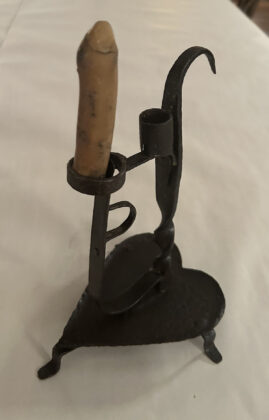 All right, so now that the pioneers had tallow candles aplenty — by the score, by the gross, by the boxful — the question became how to burn them efficiently without burning down the barnhouse? The answer was the candleholder.