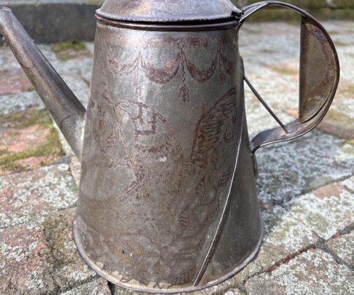 In addition to decorative work that was an inherent part of the coffee pot’s structure, both the New Englanders and Pennsylvania Germans decorated their coffee pots with vibrant and highly detailed tole painting. Common subjects included floral motifs, vining foliage and birds.