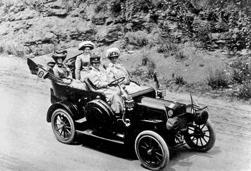 Alice Ramsey and her three companions in a new 1909 Maxwell 30 touring car prior to beginning the historic drive from coast to coast. (Wikimedia Commons photo)