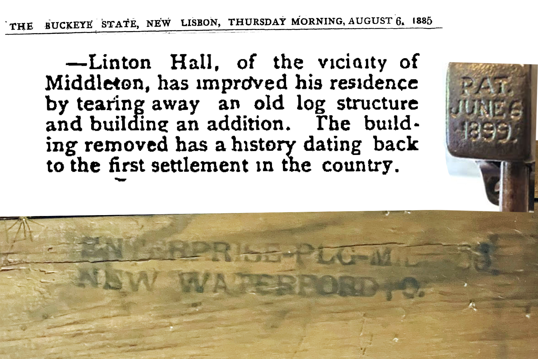I peered past an impressive array of spiderwebs to find stamped on the lumber “Enterprise Plg Mill Co. New Waterford O.”