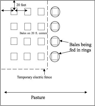 The bales were grouped on 20-foot centers in a corner of the pasture. Temporary electric fencing was used to protect the bales to be fed later, while allowing access to enough bales for three days feeding in the rings.