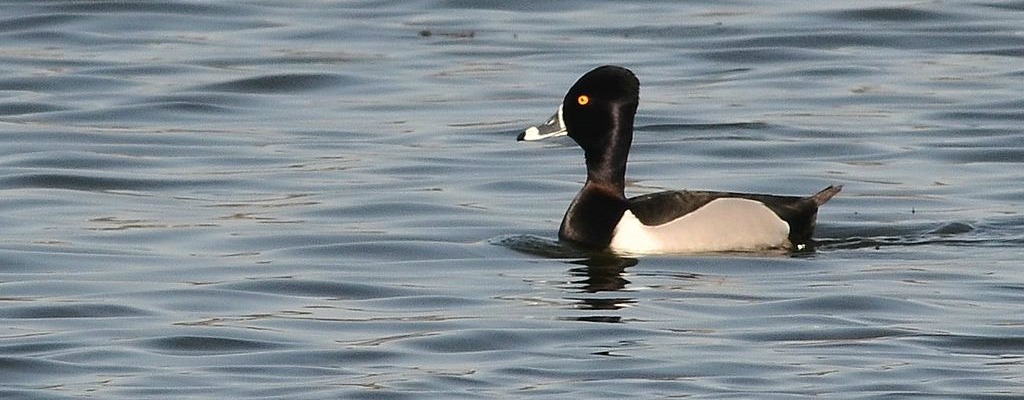 Ring-necked duck. This 1.5-pound duck is poorly named. It has a white ring near bill tip, and its head may appear pointed. It has a gold eye with a dark head, breast and back, and gray sides.